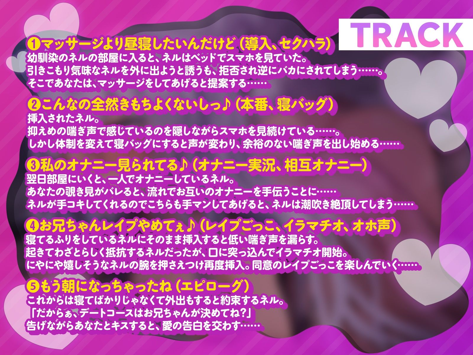 ジャンル: 処女、幼なじみ、ラブラブ・あまあま、日常・生活、男性向け、成人向け、バイノーラル、アヘ顔、オホ声、KU100、ダウナー、だいしゅきホールド