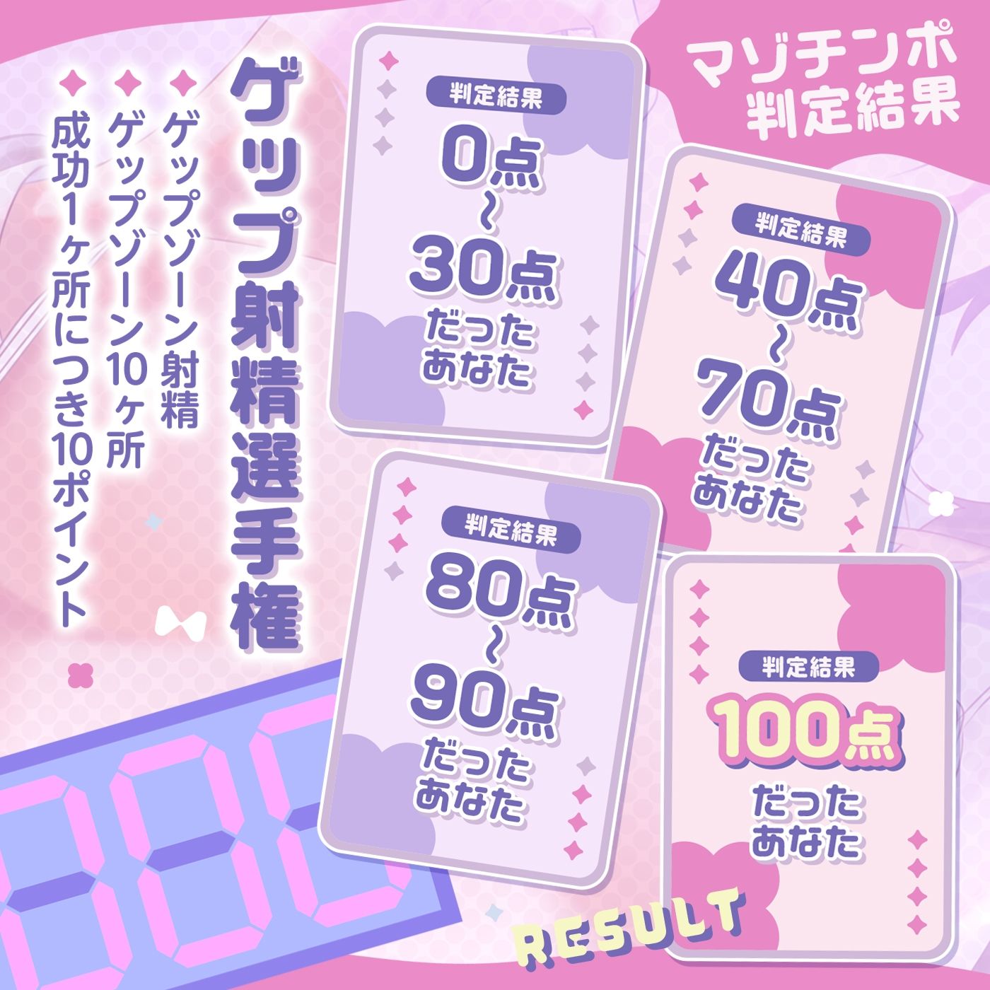 決められたスピードの中、ゲップのタイミングで射精できればポイントをゲットできます。ゲップゾーンはカウントダウン後の数秒間となります。屈辱感を味わいながらのゲップ射精をお楽しみください。