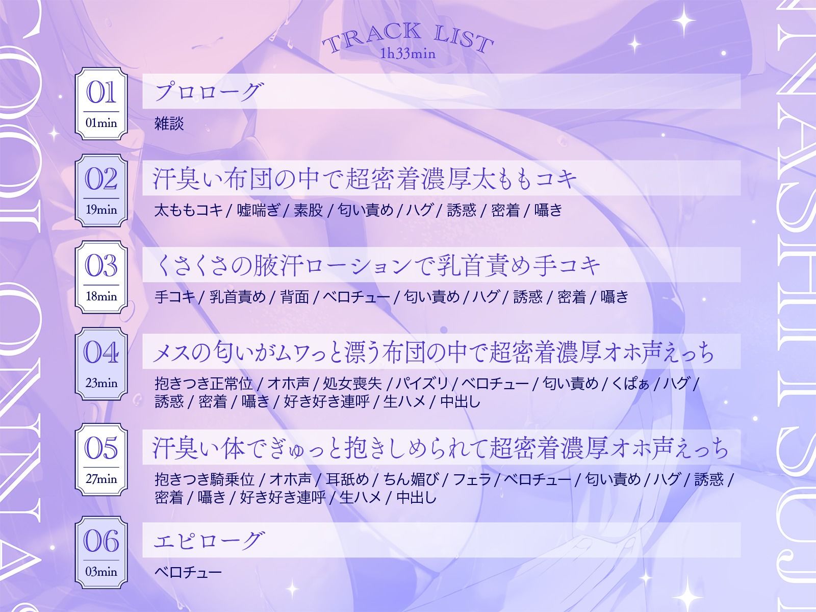 [手コキ/乳首責め/背面/ベロチュー/匂い責め/ハグ/誘惑/密着/囁き]